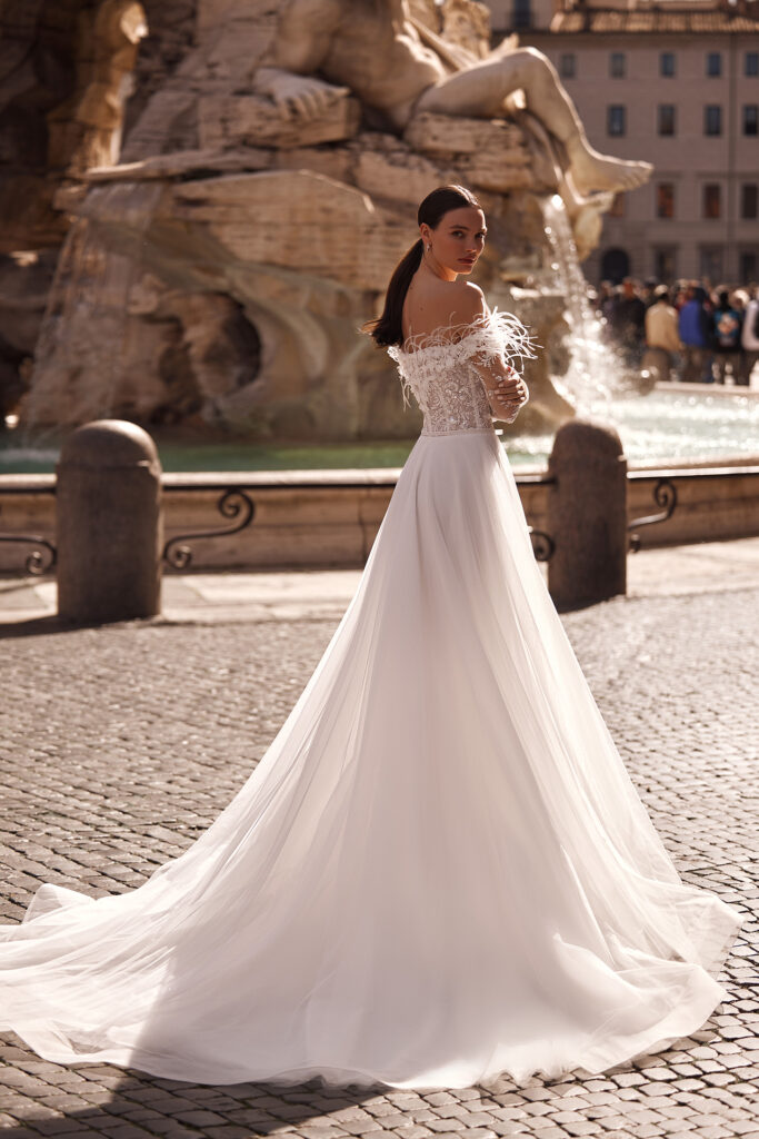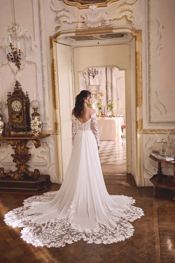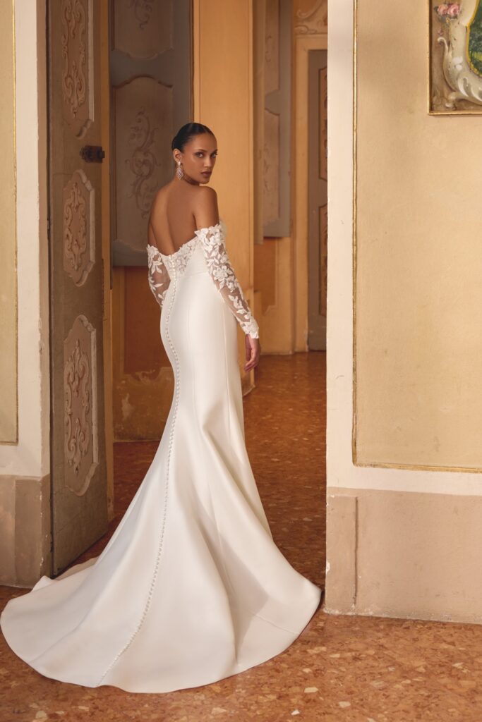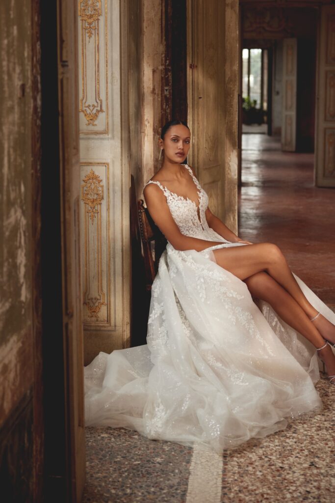 Linee pulite, pizzi ricercati, volumi leggeri e tagli iconici definiscono uno stile raffinato e senza tempo.